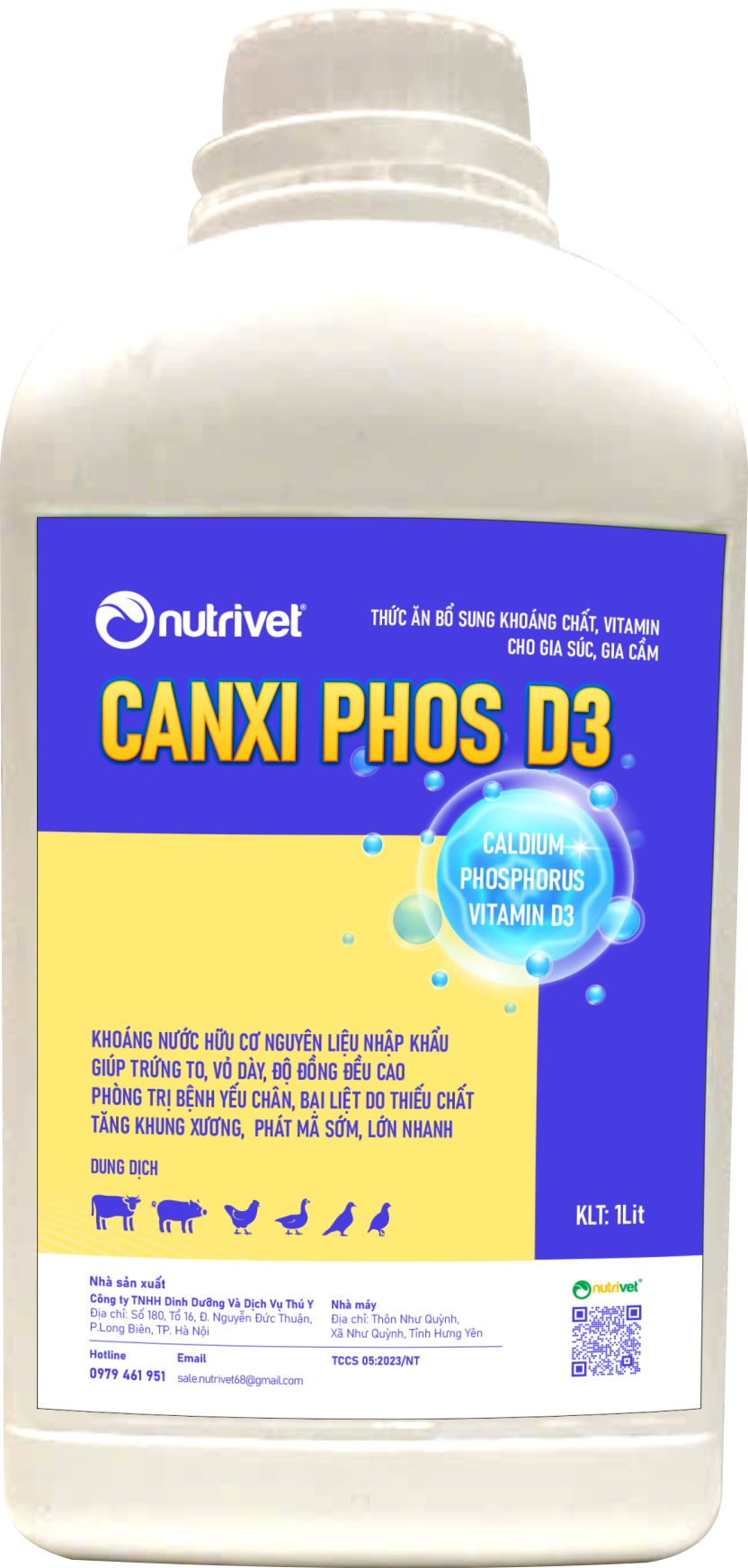 CANXIPHOS D3 LÀ SẢN PHẨM DÒNG NƯỚC của Công ty TNHH Dinh dưỡng và Dịch vụ Thú Y (Nutrivet). CANXIPHOS D3 là khoáng nước hữu cơ nguyên liệu nhập khẩu, trứng to, vỏ dày, độ đồng đều cao, Phòng trị bệnh yếu chân, bại liệt do thiếu chất, tăng khung xương, phát mã sớm, lớn nhanh.