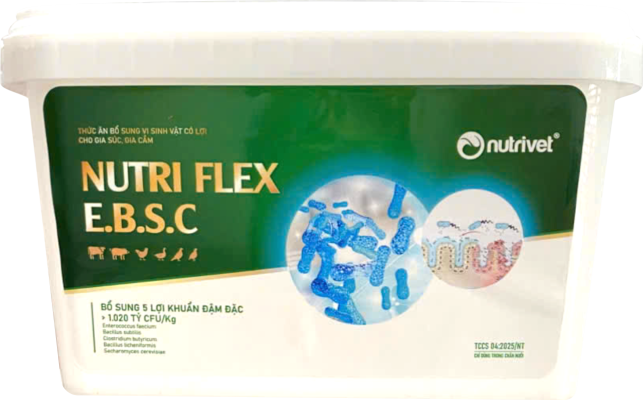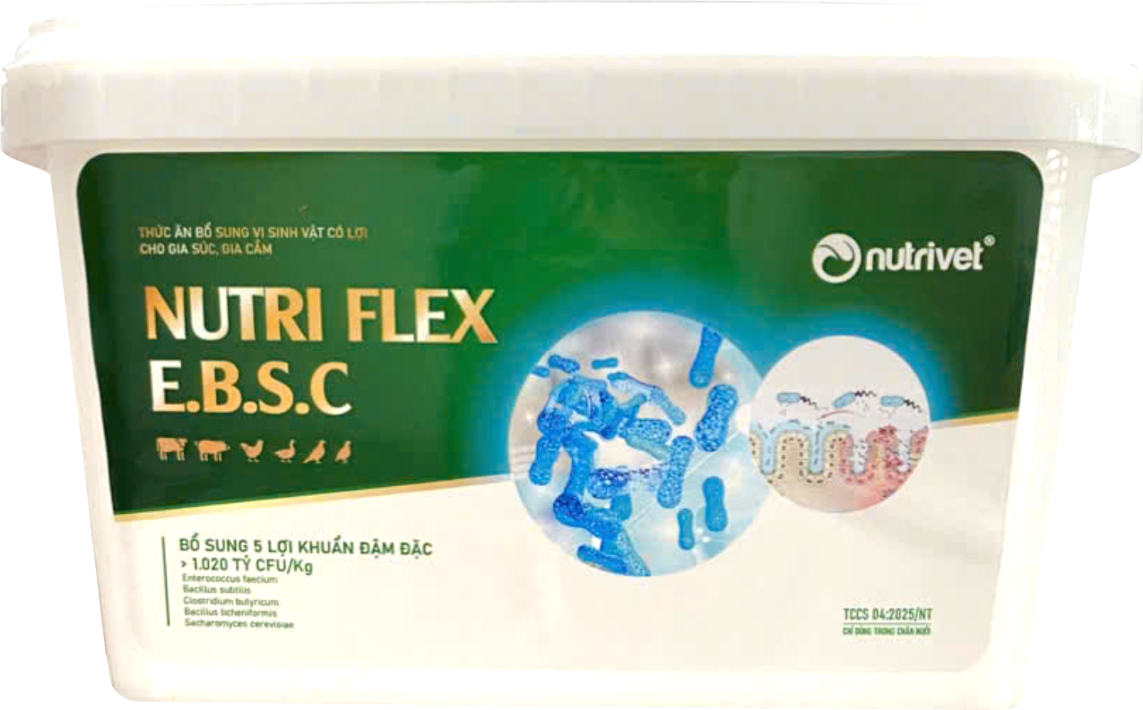 NUTRI FLEX E.B.S.C LÀ DÒNG SẢN PHẨM CAO CẤP của Công ty TNHH Dinh dưỡng và Dịch vụ Thú Y (Nutrivet). NUTRI FLEX E.B.S.C giúp Cân bằng vi sinh đường ruột, giảm vi khuẩn gây bệnh. Vật nuôi ăn khỏe, lớn nhanh, lông bóng mượt. Tăng hấp thu, tăng năng suất, phân khô – giảm mùi hôi và khí độc chuồng nuôi.