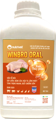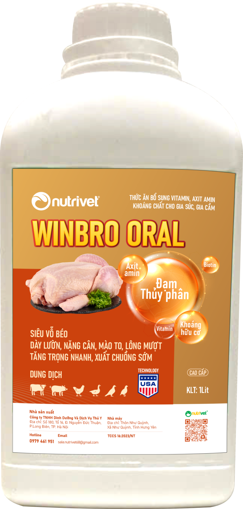 WINBRO ORAL LÀ SẢN PHẨM VỖ BÉO CAO CẤP DÒNG NƯỚC của Công ty TNHH Dinh dưỡng và Dịch vụ Thú Y (Nutrivet). Winbro Oral siêu vỗ béo, giúp vật nuôi Dày lườn, nặng cân, mào to, lông mượt, tăng trọng nhanh, xuất chuồng sớm.